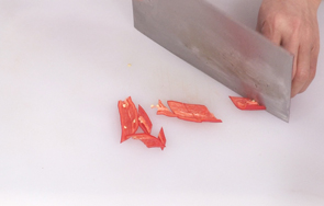 洗净的红椒切开,去籽,切小块。