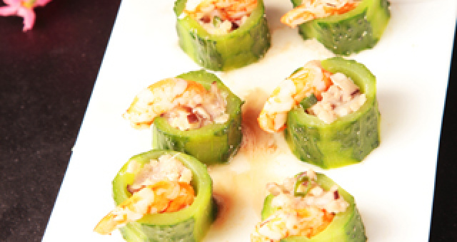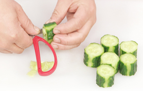 将去皮洗净的黄瓜切段,掏空瓜瓤。