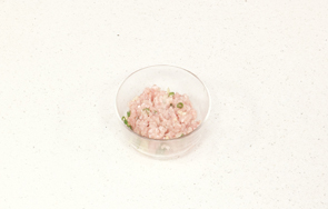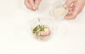 把肉末装碗中,撒上蒜末、葱花,放入料酒、白胡椒粉。