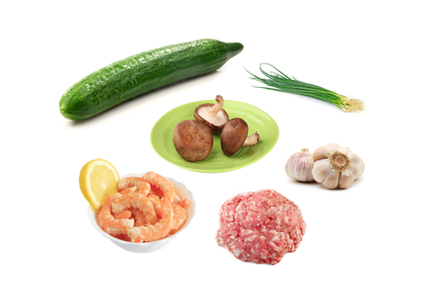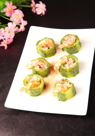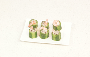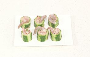 将切好的黄瓜段摆放在蒸盘中,填入馅料,插上洗净的虾仁,待用。