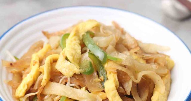 饼丝搭配豆芽、鸡蛋,就算是没有肉,味道也十足。