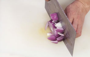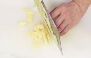 去皮洗净的土豆对半切开,斜刀切段,然后再改切成片。