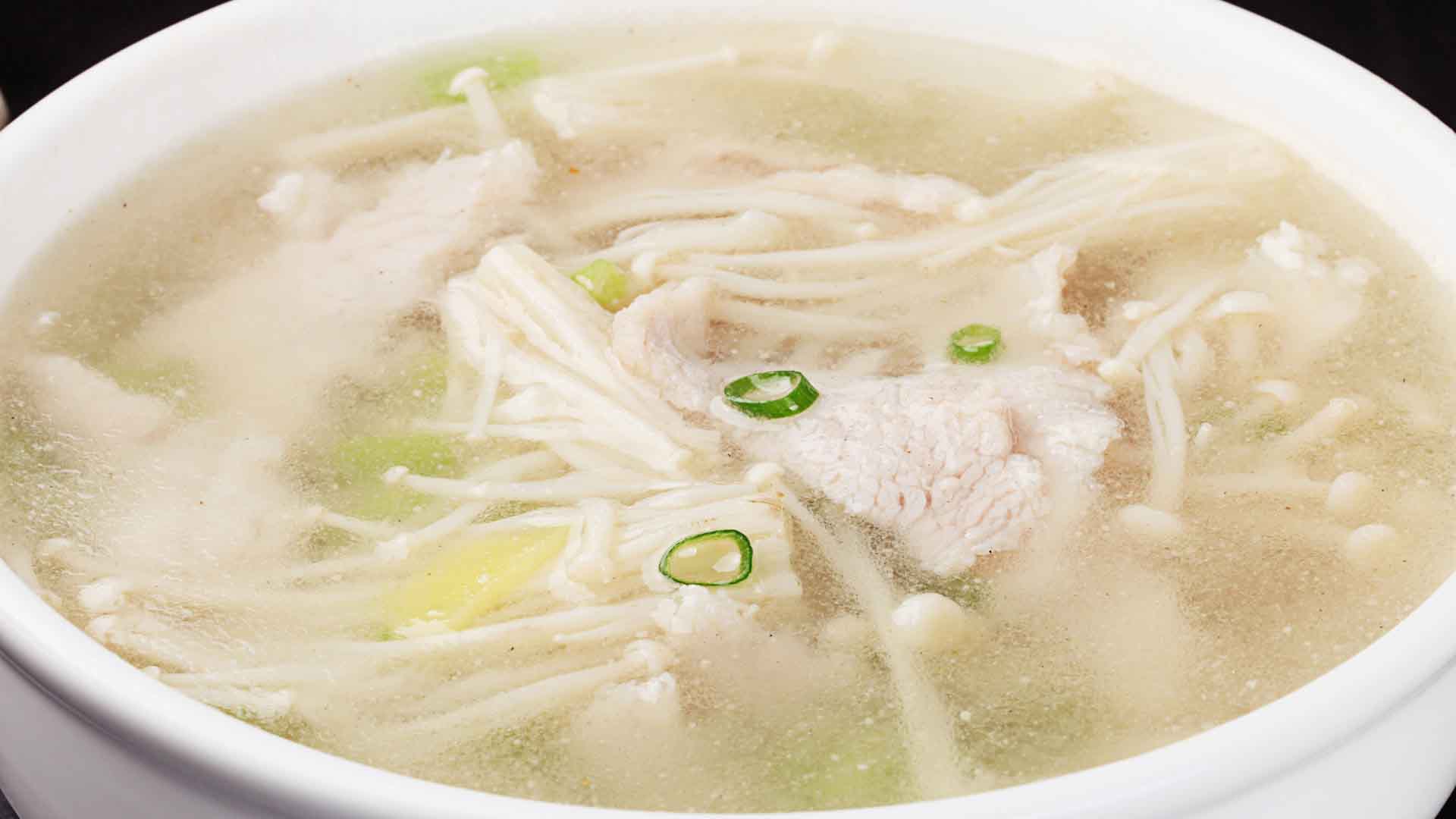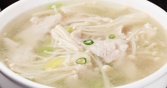 一碗靓汤里有红白绿,颜色鲜颜,氛围养眼,滑溜溜的金针菇,配上清香的芹菜,一口喝下去,利尿降压效果是极好的。
