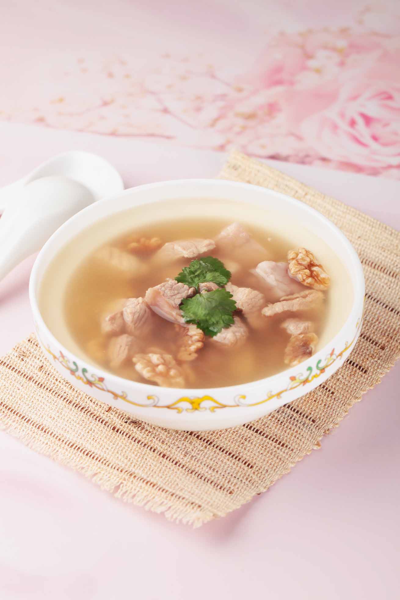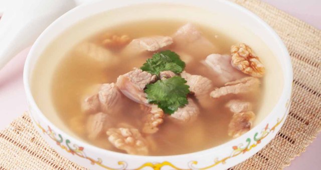 核桃含有亚油酸和大量的维生素E,是养颜益寿的上佳食品。将核桃和安神的茯苓、鲜美的瘦肉一起煮汤,好吃,促食欲,还有助眠养颜的功效。
