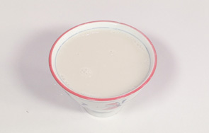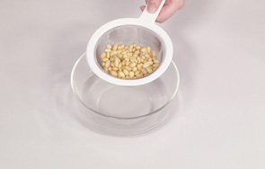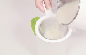 将豆浆机断电,取下机头,把榨好的豆浆倒入滤网,滤去豆渣。