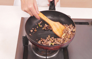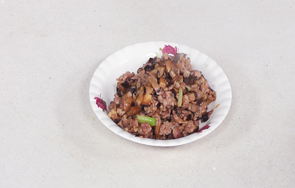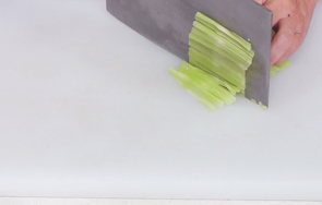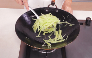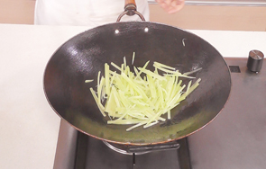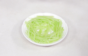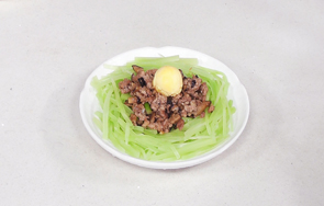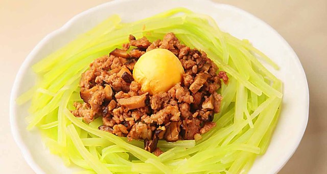 刀光剑影中,莴笋变成了一窝玉丝,衬托着浓香的肉酱,再点缀一颗黄灿灿的“明珠”,引人入胜。