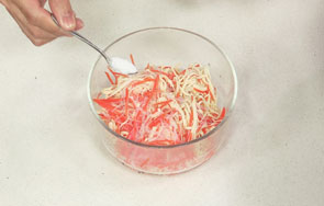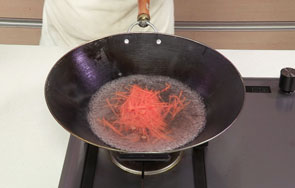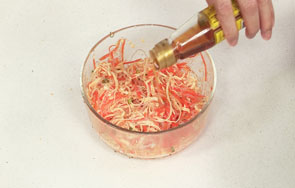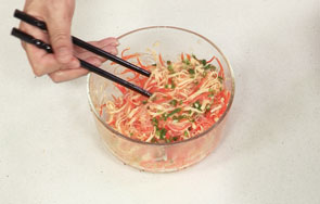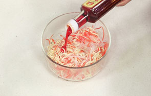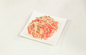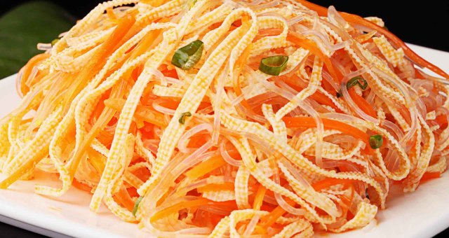 这道凉拌三丝由胡萝卜丝、粉丝、千张丝汆煮至断生,凉拌而成。操作简单,作为一盘开胃小菜再好也不过。